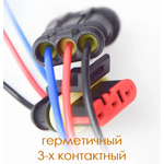 Разъем автомобильный трехконтактный герметичный SUPERSEAL папа+мама (3-pin, трехпиновый, 3-х контактный). Высококачественные герметичные разъемы Super Seal предназначены для подключения дополнительного электрооборудования в местах возможного воздействия влаги и грязе-солевой смеси. Герметичность обеспечивается силиконовыми уплотнителями контактов и замка разъема. Влагозащищенный электрический разъем применяется в автомобилях, мотоциклах, автобусах, лодках и др. Фишка состоит из трех разъемов - штекер и гнездо, защитных резинок и клемм.